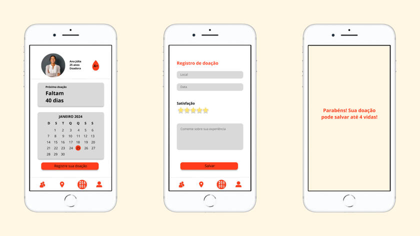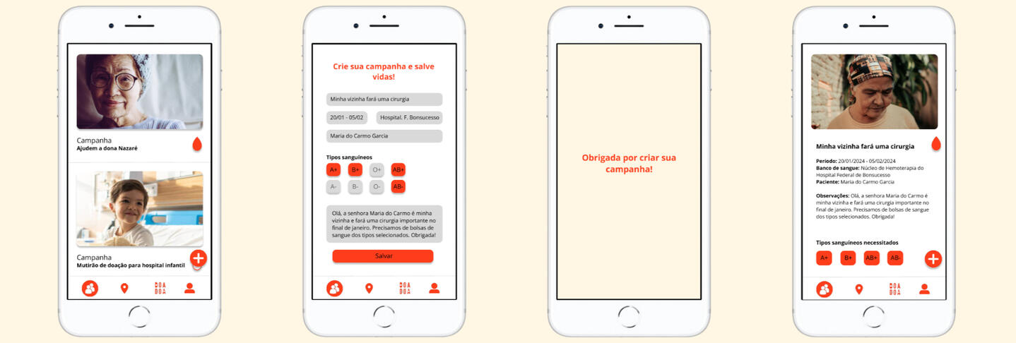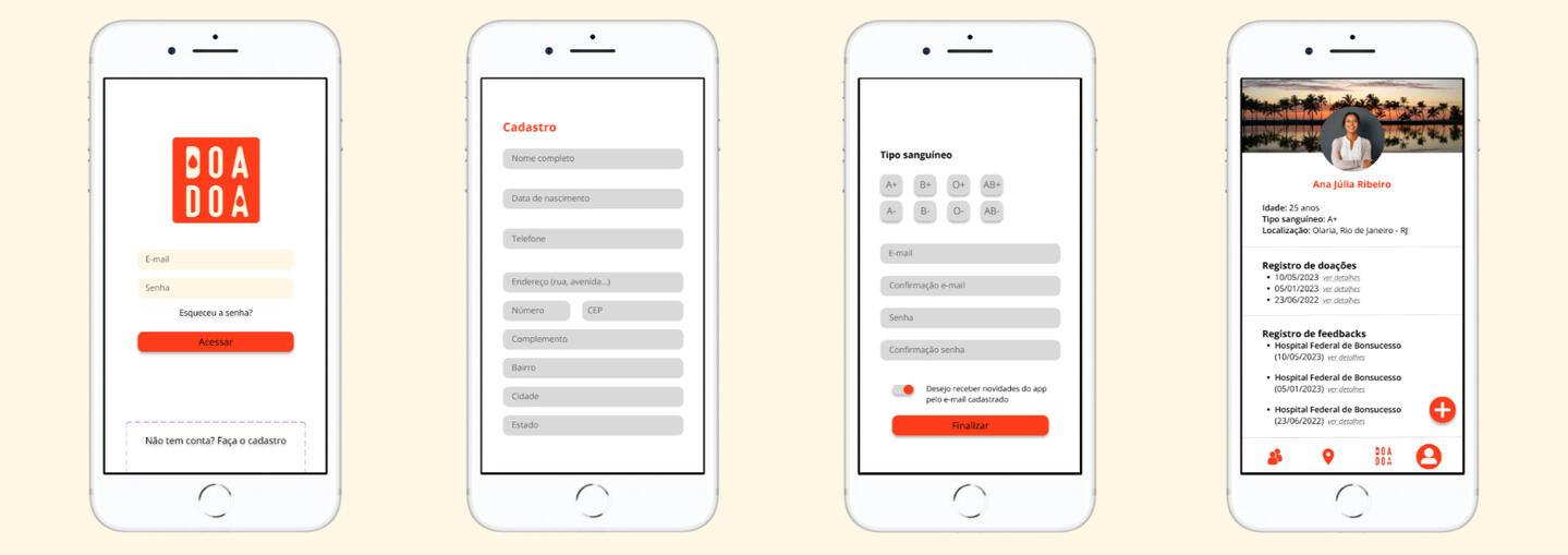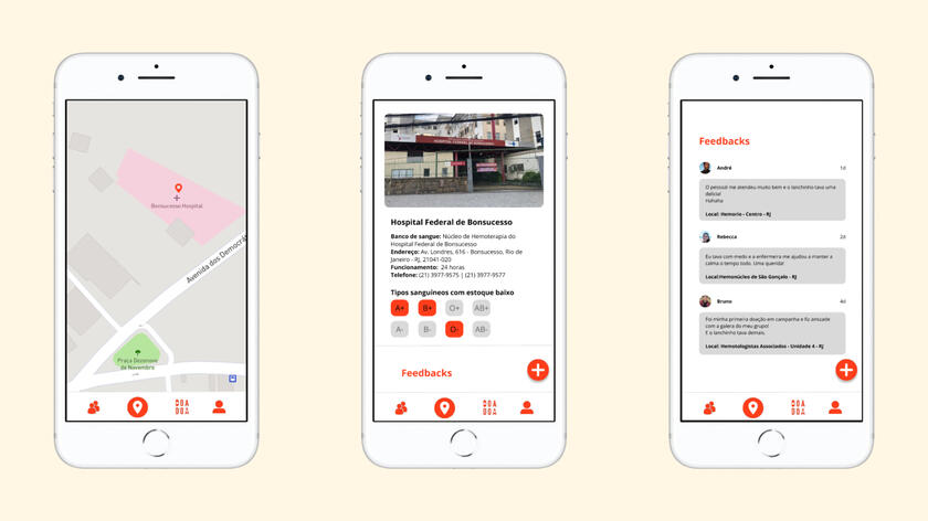 "Como influenciar e impulsionar a doação de sangue no estado do Rio de Janeiro?"DoaDoa é um aplicativo cujo objetivo é impulsionar o número de doações de sangue e auxiliar na divulgação de lugares para a coleta por meio da localização do usuário. O projeto foi desenvolvido para a disciplina Mídia Digital II, no curso de Comunicação Visual Design (UFRJ).Com 4 botões na barra de navegação: mapa das unidades de saúde (hemocentros); comunidade com campanhas de doação; calendário com contagem regressiva da próxima doação; e perfil do usuário, com datas, locais e feedbacks registrados.