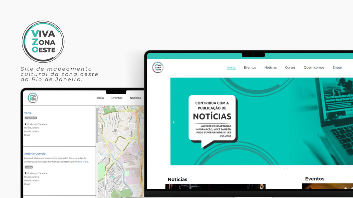 "Como dar visibilidade à cultura da zona oeste do Rio de Janeiro?"Viva Zona Oeste é um site cujo objetivo é mapear atividades culturais na zona oeste do Rio de Janeiro. O projeto foi desenvolvido para a disciplina Software Livre e Metodologias Participativas, ofertada pelo Departamento de Engenharia Eletrônica (DEL/POLI/UFRJ) com participação de estudantes de Comunicação Visual Design (UFRJ).A plataforma conta com mapeamento cultural; divulgação de serviços, eventos e notícias; e facilita o acesso aos cursos do grupo cultural Viva Zona Oeste.